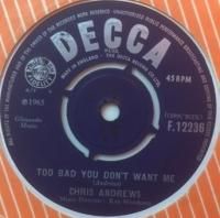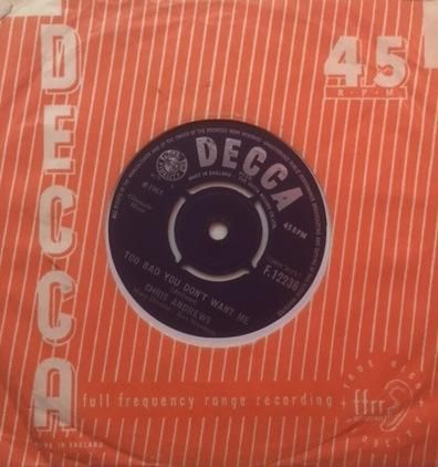 アダム・フェイス等に曲の提供もしていた英国のソングライター/シンガーのクリス・アンドリューズの'65年のソロ・シングル。B面のアップテンポなR&Bモッド作もナイスな一枚。盤面美品、カンパニースリーブ付きです。